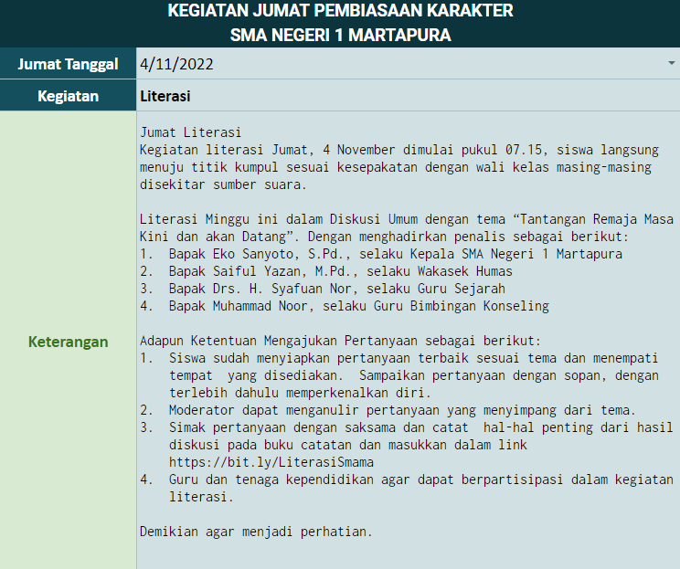 SMA Negeri 1 Martapura (17/11/2023),- Pagi Jumat Taqwa/Religi dimulai pukul 07.30 s.d. 08.00 WITA dengan rangkaian kegiatan: